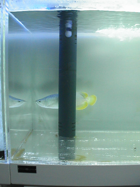 オーバーフロー給排水をするパイプ並びに、魚がぶつかっても、衝撃を和らげるように、一番外側には一回り大きなパイプが使ってあります。
